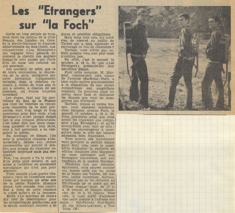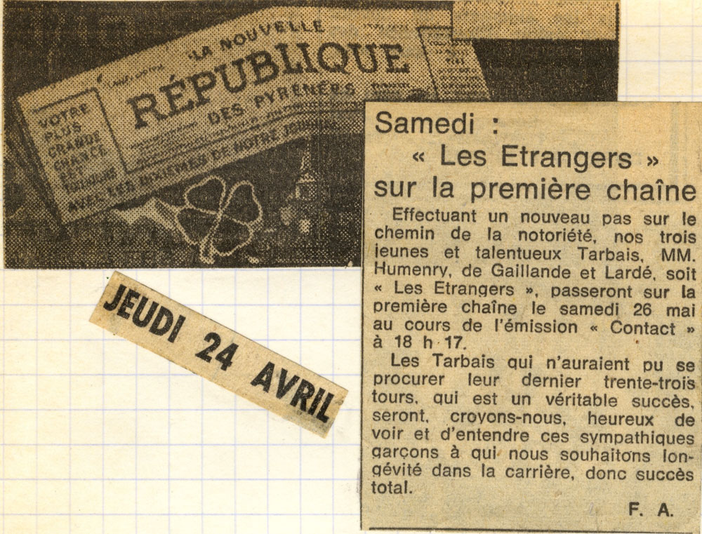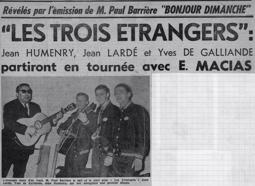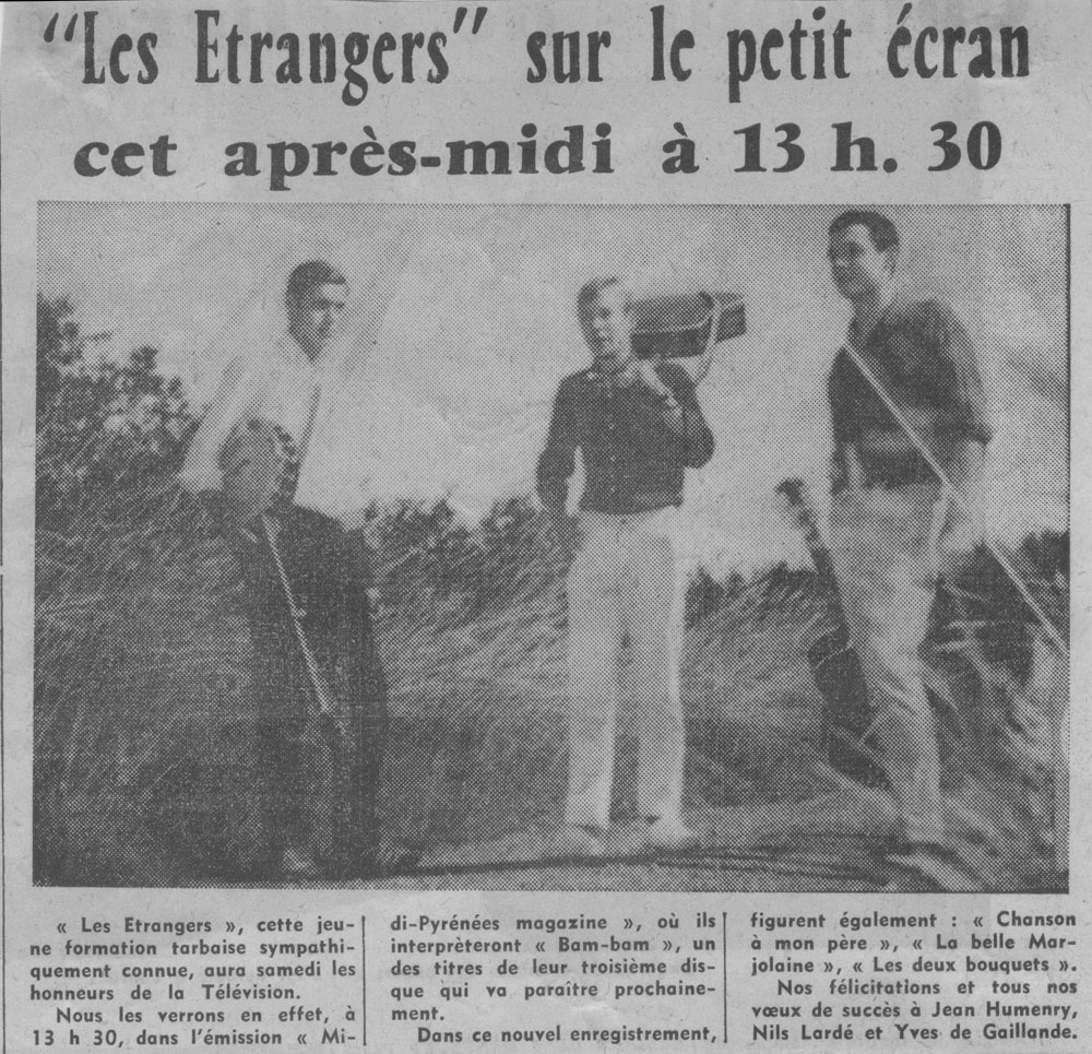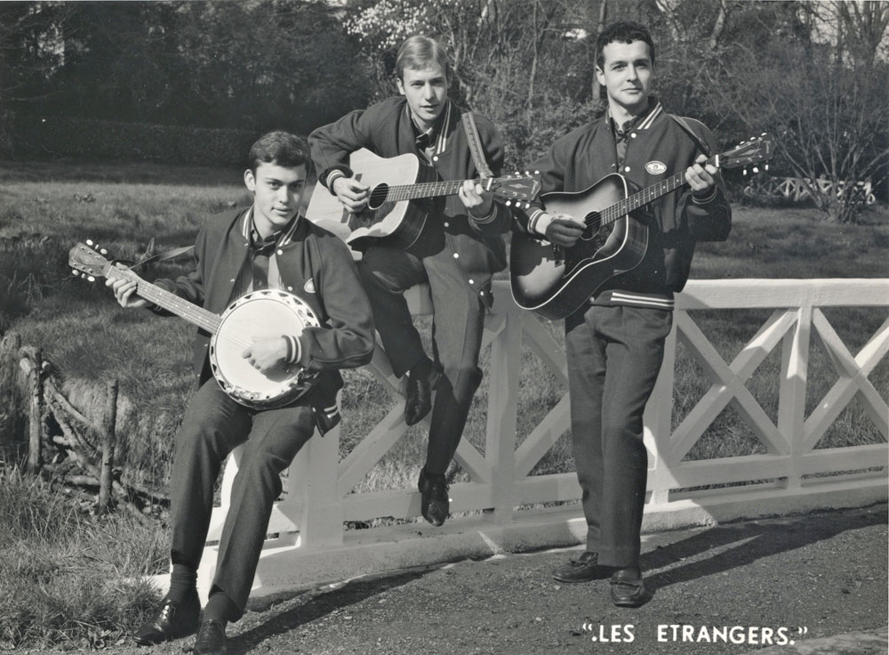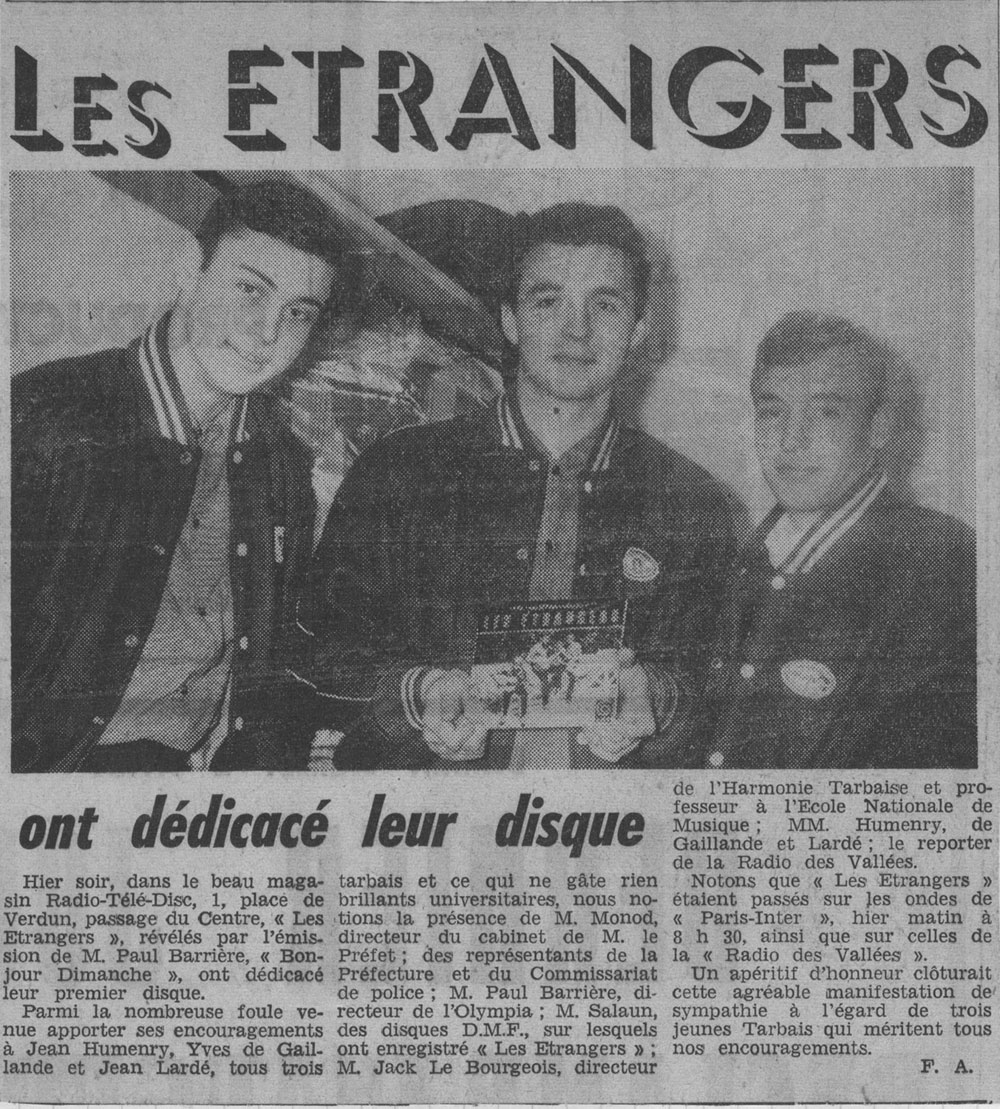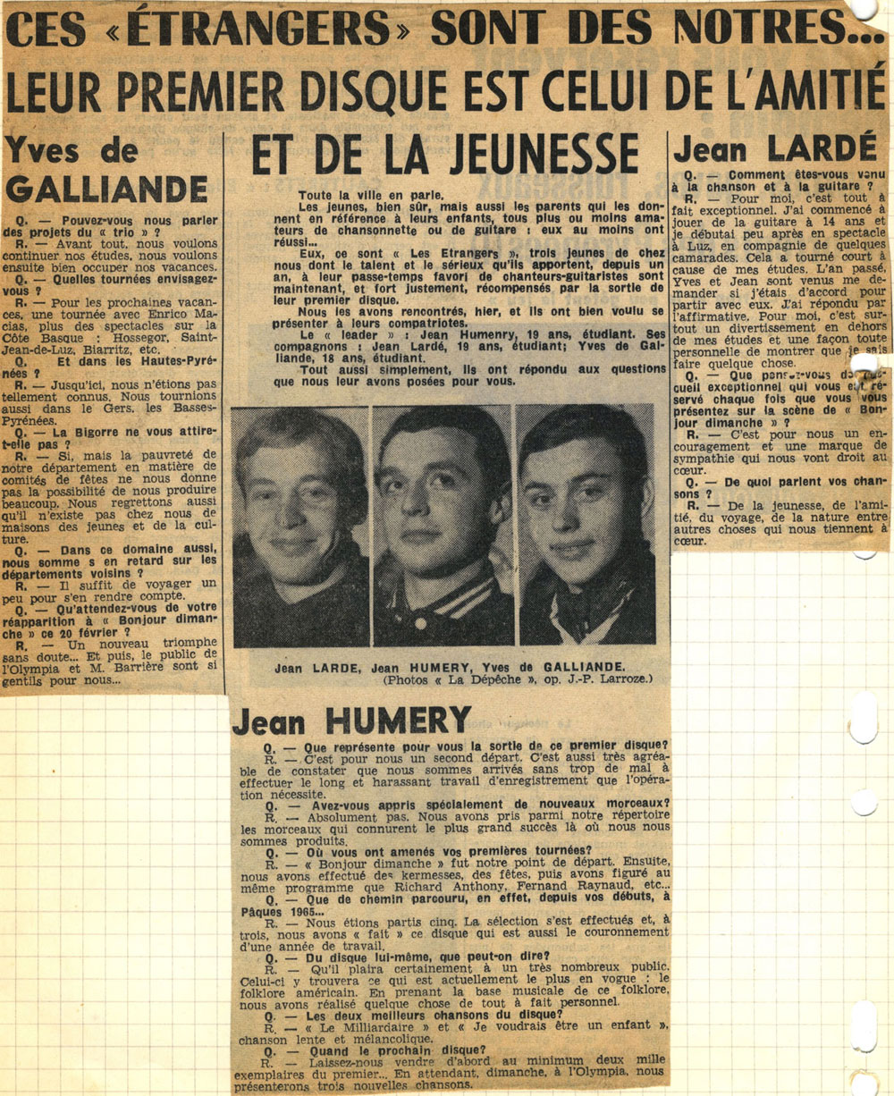 Yves de Gaillande, Nils Lardé et Jean Humenry, alias Les Etrangers, se rencontrent au lycée, à Tarbes. La guitare, le banjo, l’harmonica leur procurent le plaisir de jouer ensemble, comme tous les jeunes musiciens de leur âge. Ils sont influencés par les mélanges musicaux de cette époque entre deux eaux, entre insouciance, avidité de vivre et prise de conscience des maux de ce monde. Ils écoutent Woody Guthrie, Bob Dylan, Peter Paul and Mary, Joan Baez. Jacques Brel, Guy Béart et Hugues Aufray (qui, cette même année, chante Santiano) marquent sans doute leur désir de chanter en Français. Ils reprendront d’ailleurs N’y pense plus tout est bien, alchimie entre la musique de Dylan et l’adaptation de Pierre Delanoë et Aufray.