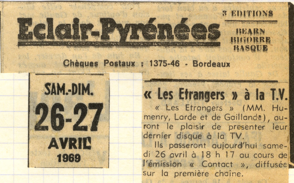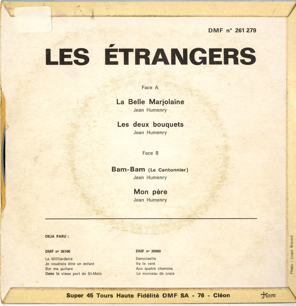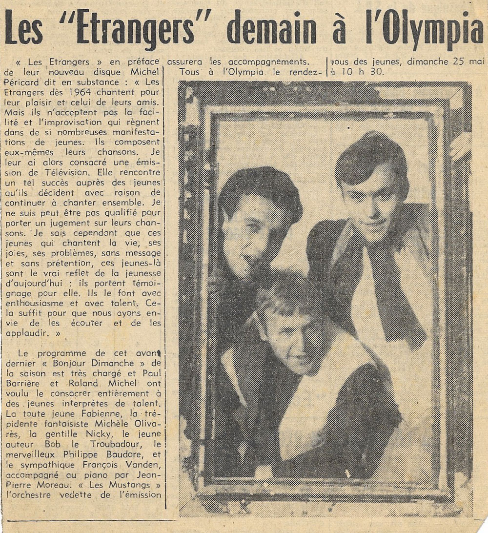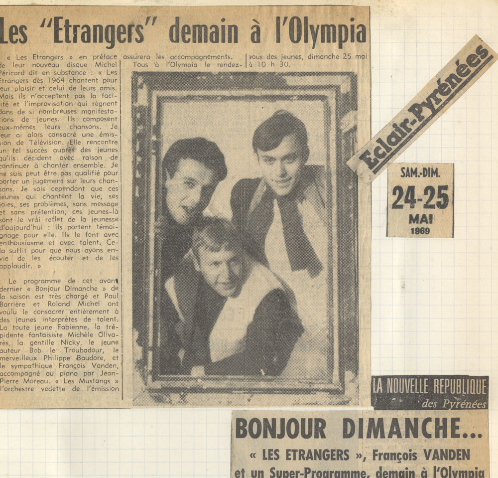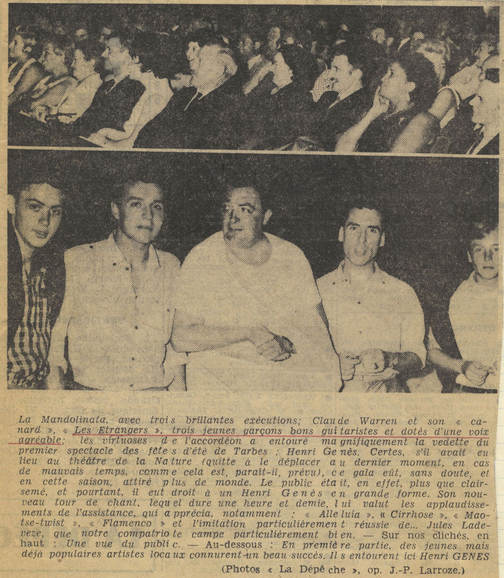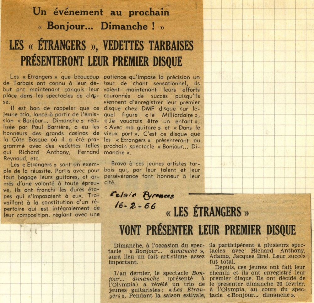 Yves de Gaillande, Nils Lardé et Jean Humenry, alias Les Etrangers, se rencontrent au lycée, à Tarbes. La guitare, le banjo, l’harmonica leur procurent le plaisir de jouer ensemble, comme tous les jeunes musiciens de leur âge. Ils sont influencés par les mélanges musicaux de cette époque entre deux eaux, entre insouciance, avidité de vivre et prise de conscience des maux de ce monde. Ils écoutent Woody Guthrie, Bob Dylan, Peter Paul and Mary, Joan Baez. Jacques Brel, Guy Béart et Hugues Aufray (qui, cette même année, chante Santiano) marquent sans doute leur désir de chanter en Français. Ils reprendront d’ailleurs N’y pense plus tout est bien, alchimie entre la musique de Dylan et l’adaptation de Pierre Delanoë et Aufray.