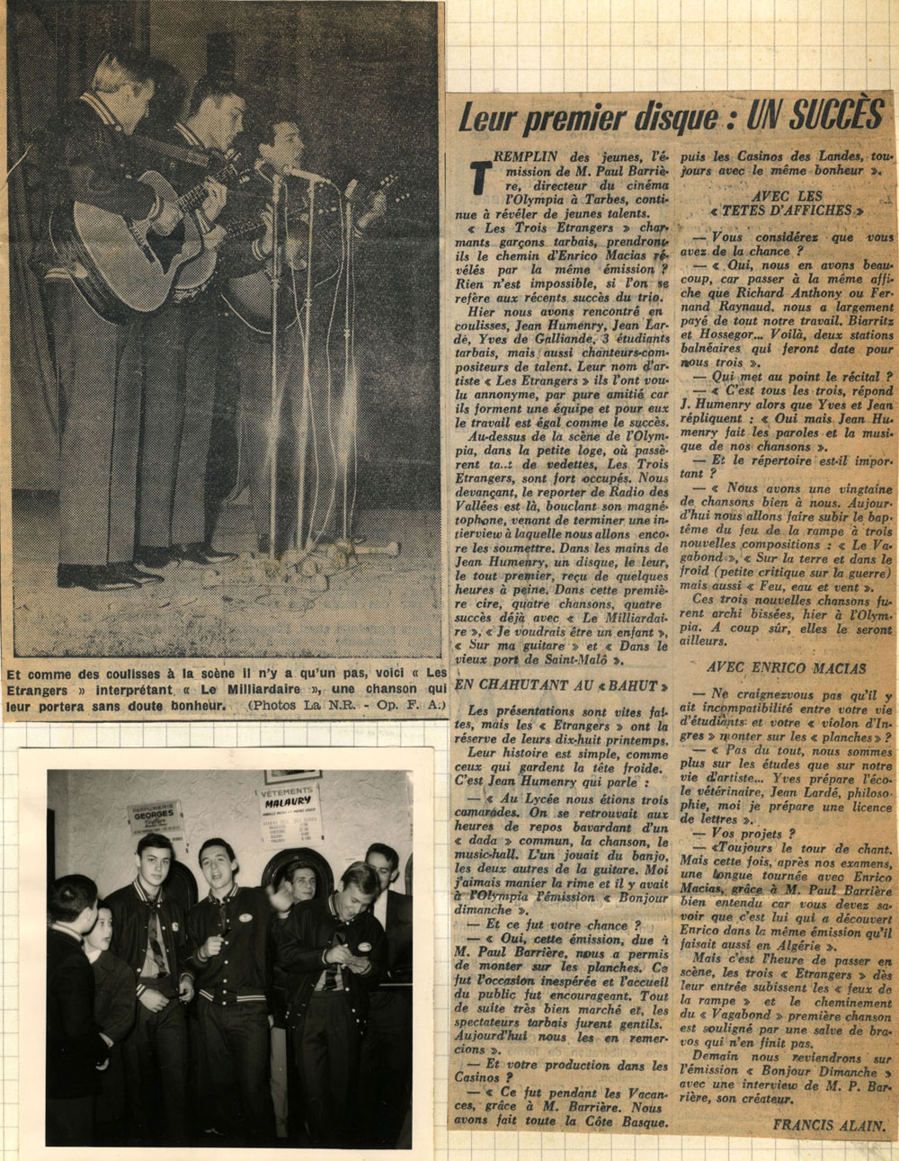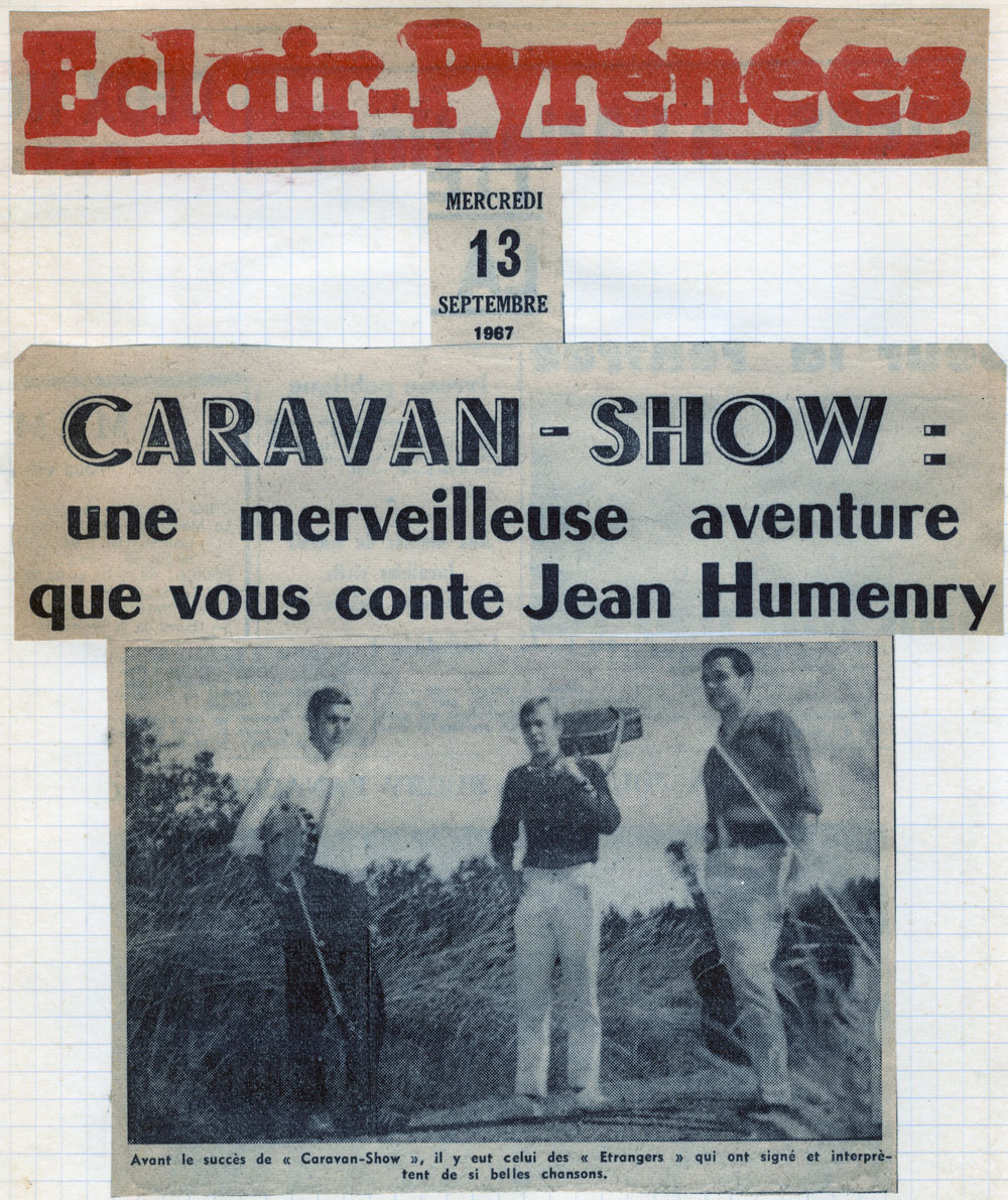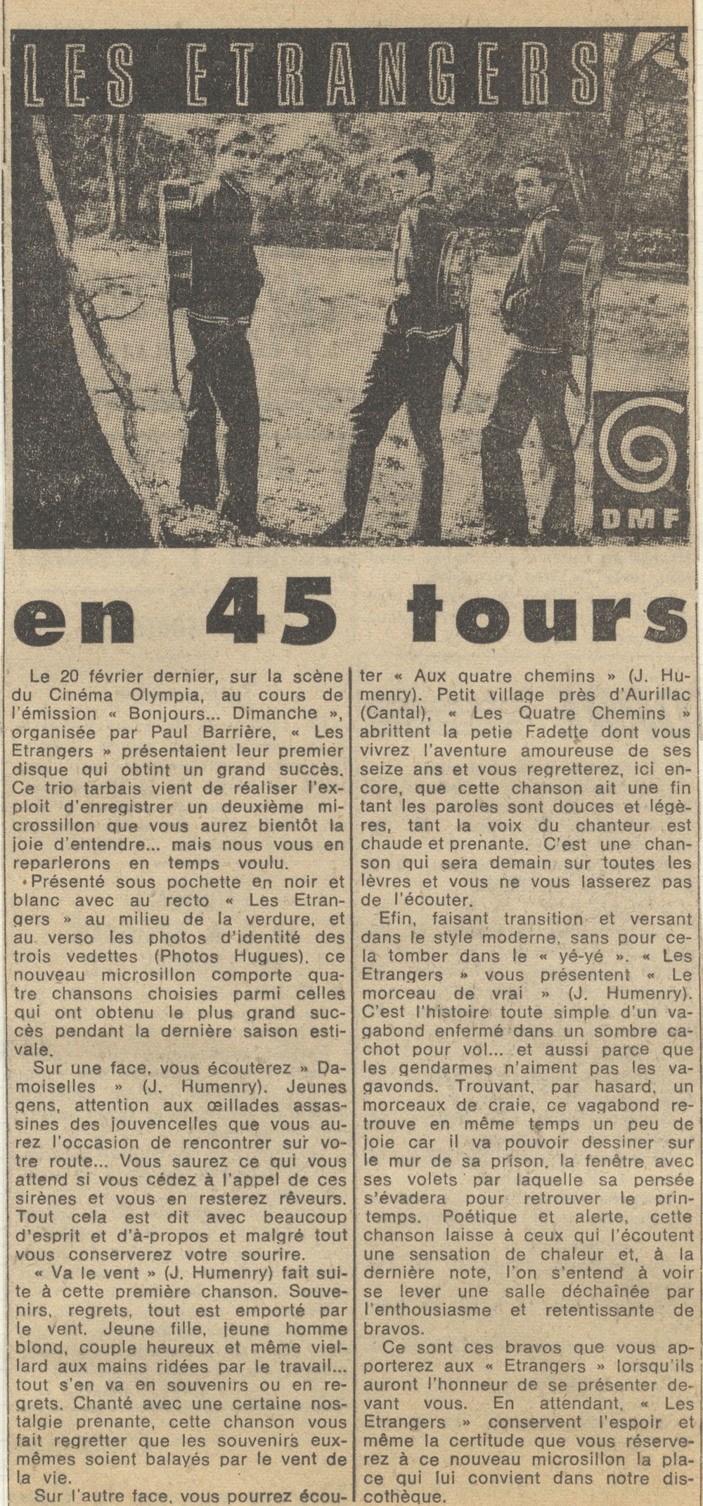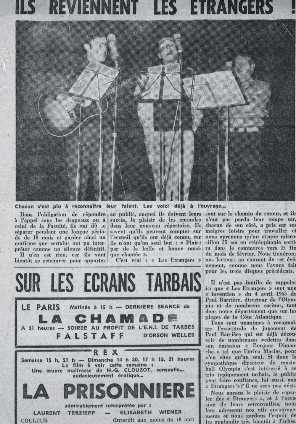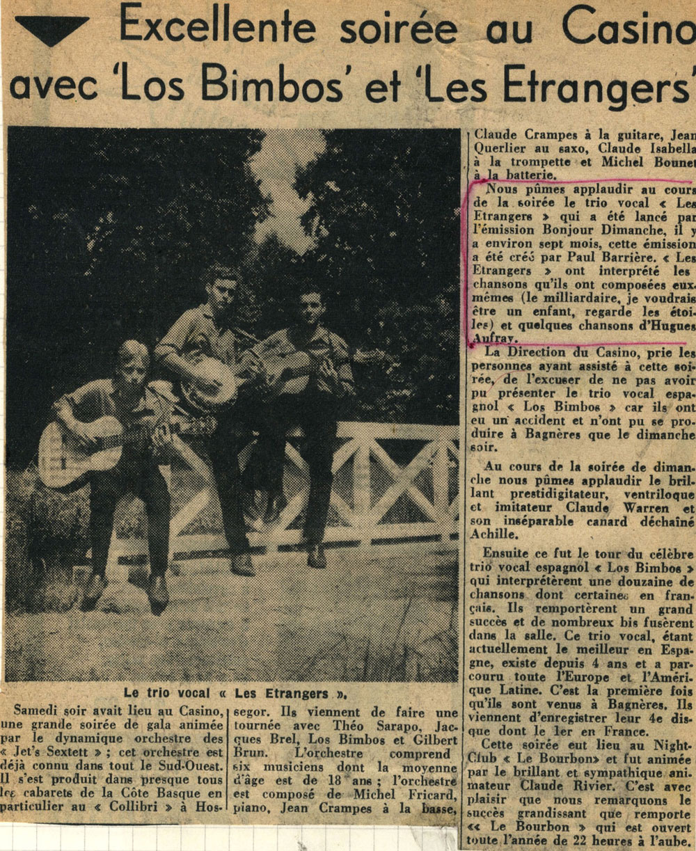 Yves de Gaillande, Nils Lardé et Jean Humenry, alias Les Etrangers, se rencontrent au lycée, à Tarbes. La guitare, le banjo, l’harmonica leur procurent le plaisir de jouer ensemble, comme tous les jeunes musiciens de leur âge. Ils sont influencés par les mélanges musicaux de cette époque entre deux eaux, entre insouciance, avidité de vivre et prise de conscience des maux de ce monde. Ils écoutent Woody Guthrie, Bob Dylan, Peter Paul and Mary, Joan Baez. Jacques Brel, Guy Béart et Hugues Aufray (qui, cette même année, chante Santiano) marquent sans doute leur désir de chanter en Français. Ils reprendront d’ailleurs N’y pense plus tout est bien, alchimie entre la musique de Dylan et l’adaptation de Pierre Delanoë et Aufray.