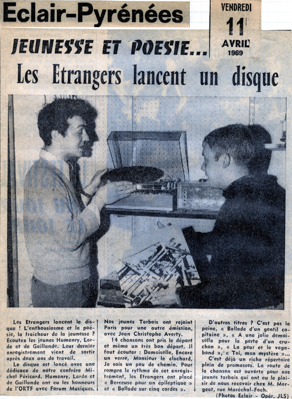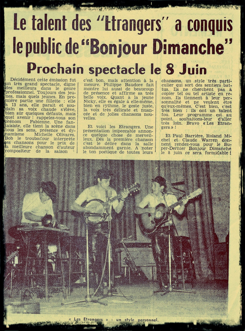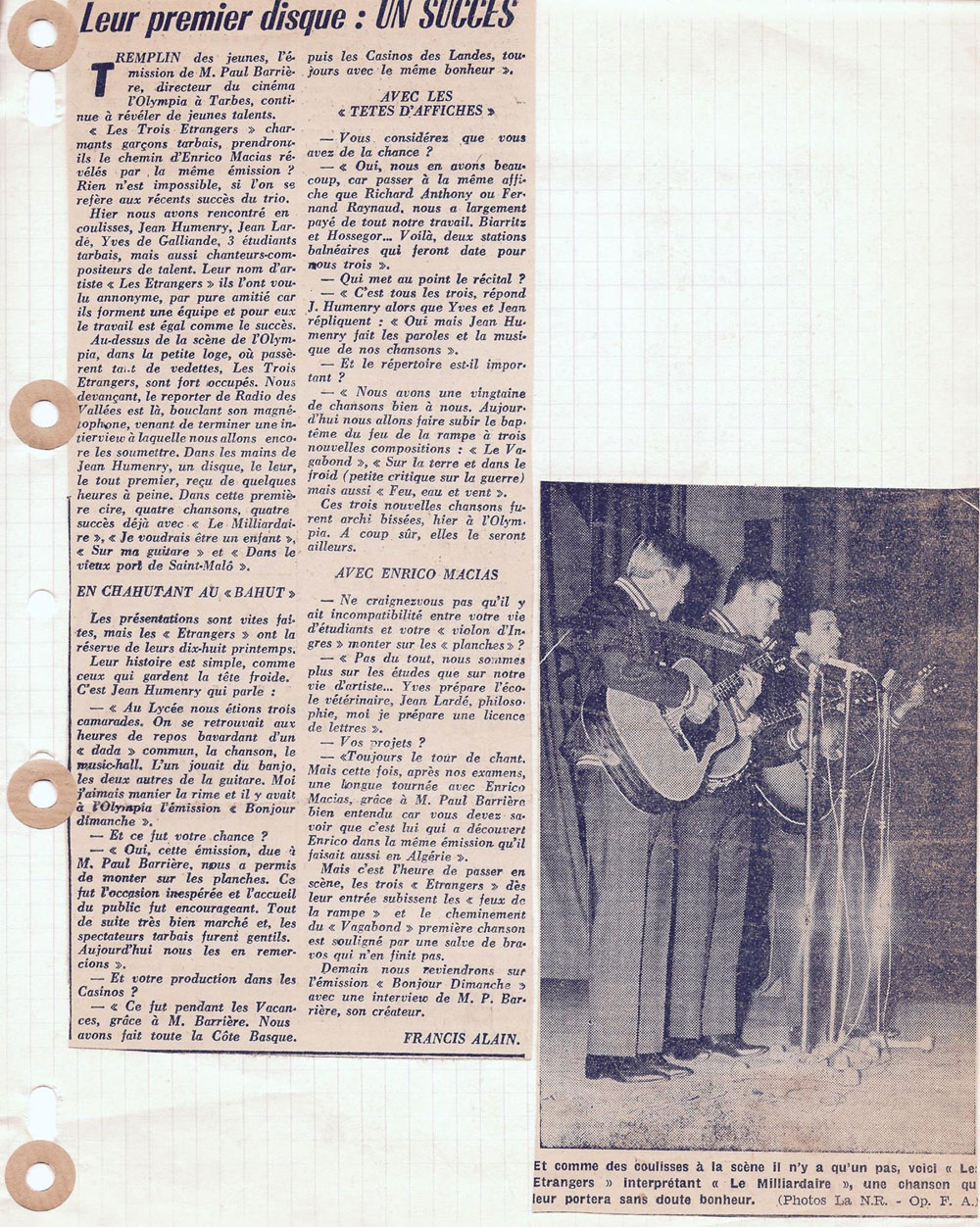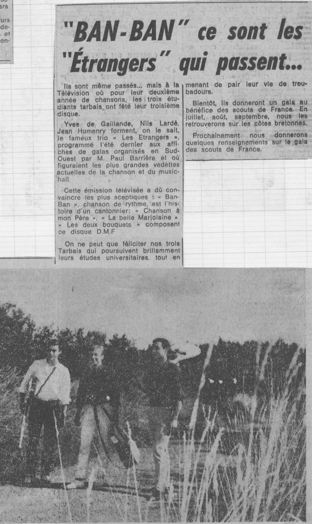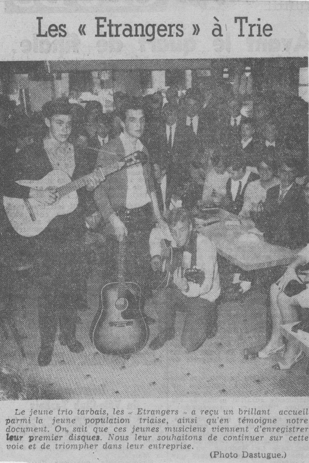 Yves de Gaillande, Nils Lardé et Jean Humenry, alias Les Etrangers, se rencontrent au lycée, à Tarbes. La guitare, le banjo, l’harmonica leur procurent le plaisir de jouer ensemble, comme tous les jeunes musiciens de leur âge. Ils sont influencés par les mélanges musicaux de cette époque entre deux eaux, entre insouciance, avidité de vivre et prise de conscience des maux de ce monde. Ils écoutent Woody Guthrie, Bob Dylan, Peter Paul and Mary, Joan Baez. Jacques Brel, Guy Béart et Hugues Aufray (qui, cette même année, chante Santiano) marquent sans doute leur désir de chanter en Français. Ils reprendront d’ailleurs N’y pense plus tout est bien, alchimie entre la musique de Dylan et l’adaptation de Pierre Delanoë et Aufray.