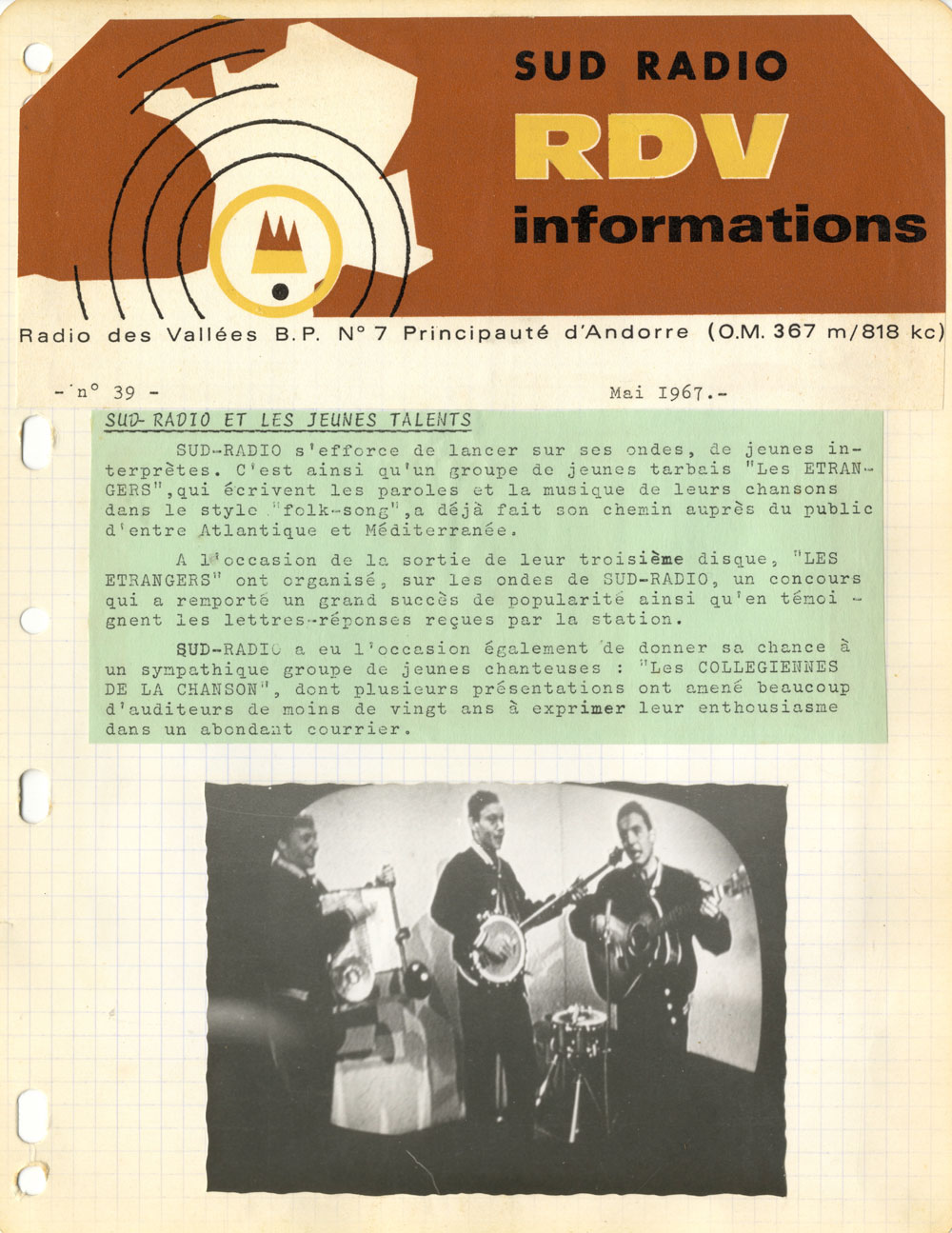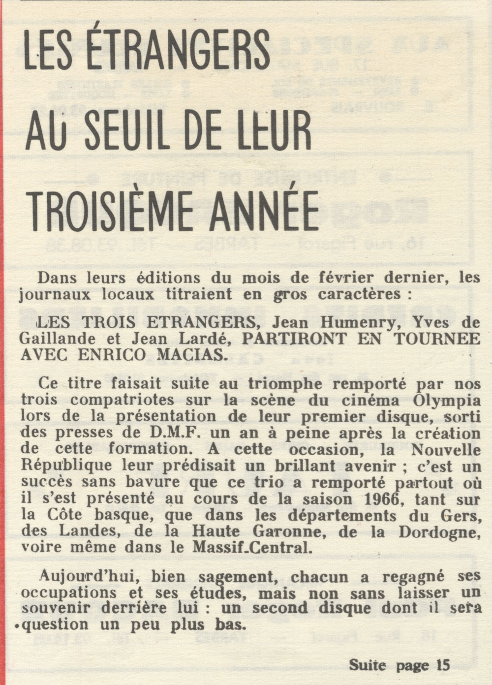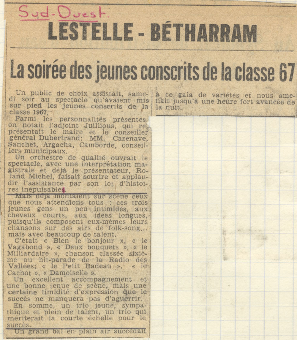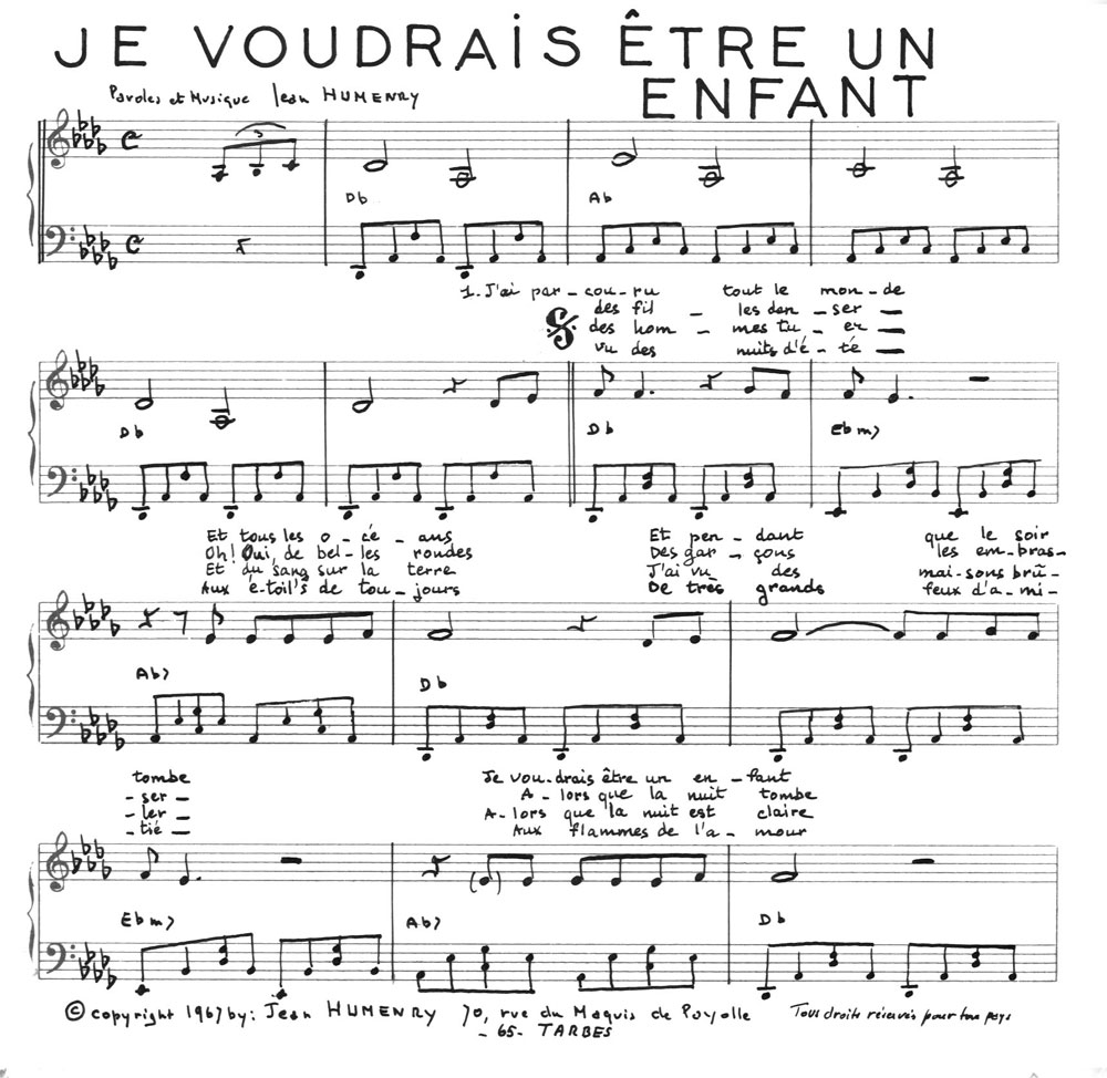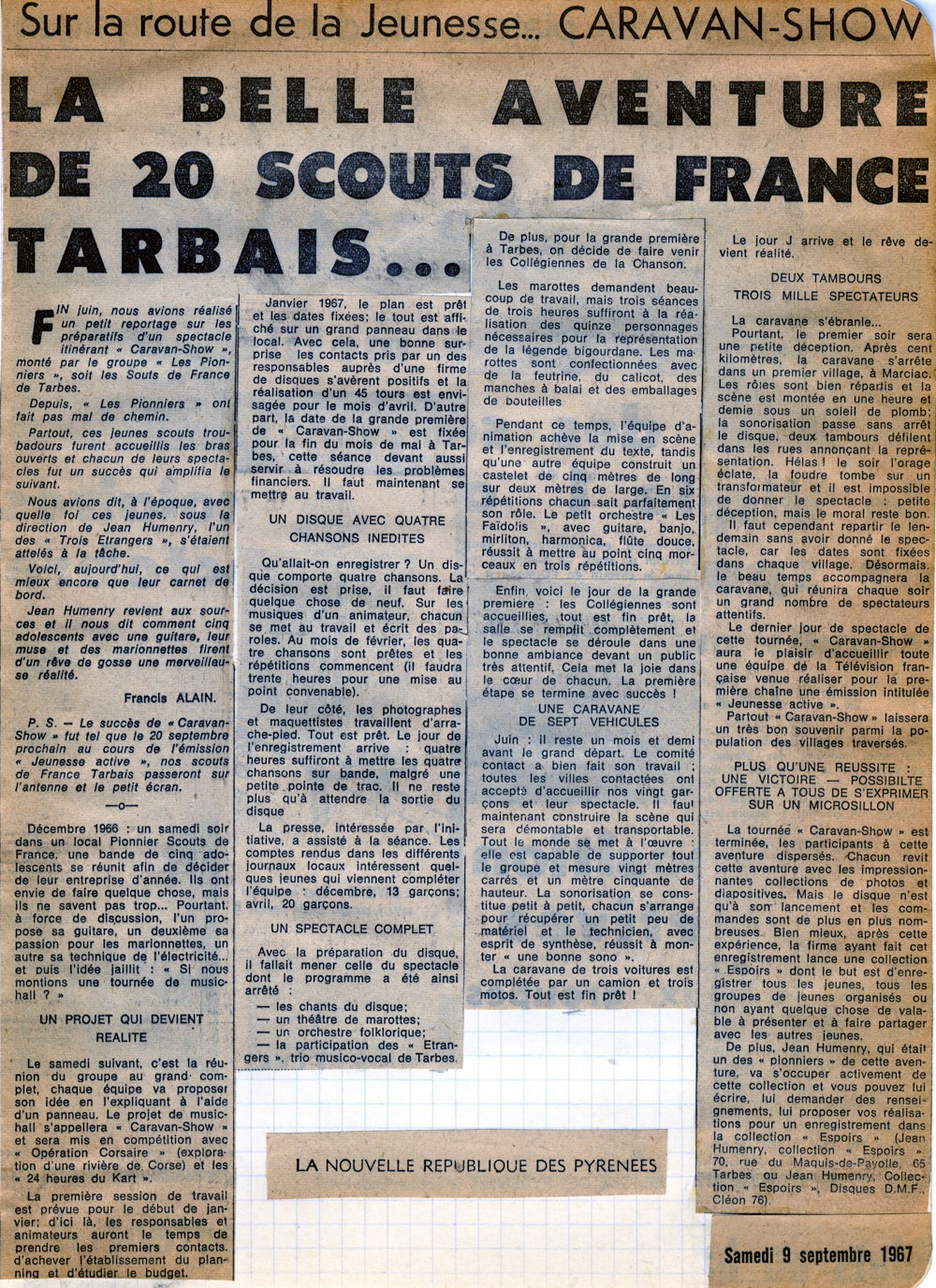 Yves de Gaillande, Nils Lardé et Jean Humenry, alias Les Etrangers, se rencontrent au lycée, à Tarbes. La guitare, le banjo, l’harmonica leur procurent le plaisir de jouer ensemble, comme tous les jeunes musiciens de leur âge. Ils sont influencés par les mélanges musicaux de cette époque entre deux eaux, entre insouciance, avidité de vivre et prise de conscience des maux de ce monde. Ils écoutent Woody Guthrie, Bob Dylan, Peter Paul and Mary, Joan Baez. Jacques Brel, Guy Béart et Hugues Aufray (qui, cette même année, chante Santiano) marquent sans doute leur désir de chanter en Français. Ils reprendront d’ailleurs N’y pense plus tout est bien, alchimie entre la musique de Dylan et l’adaptation de Pierre Delanoë et Aufray.