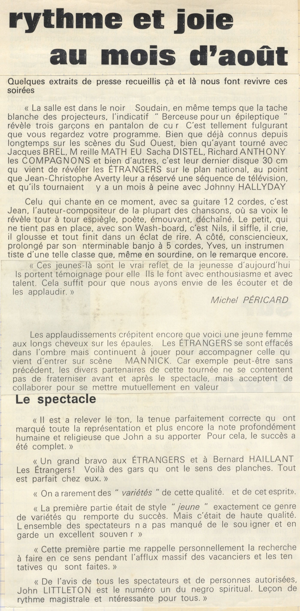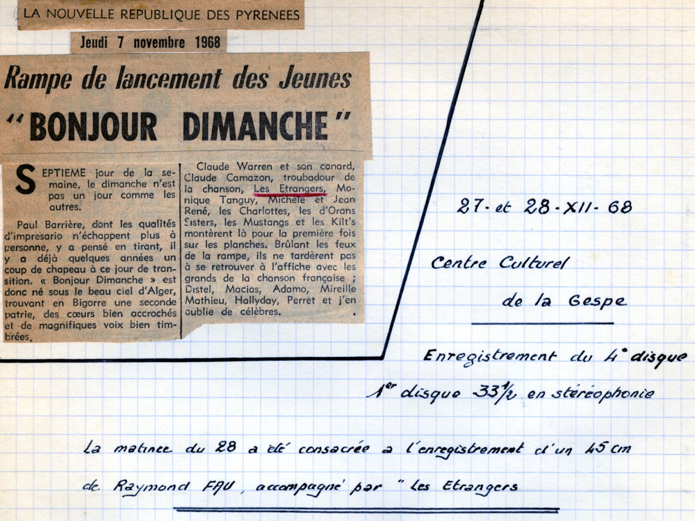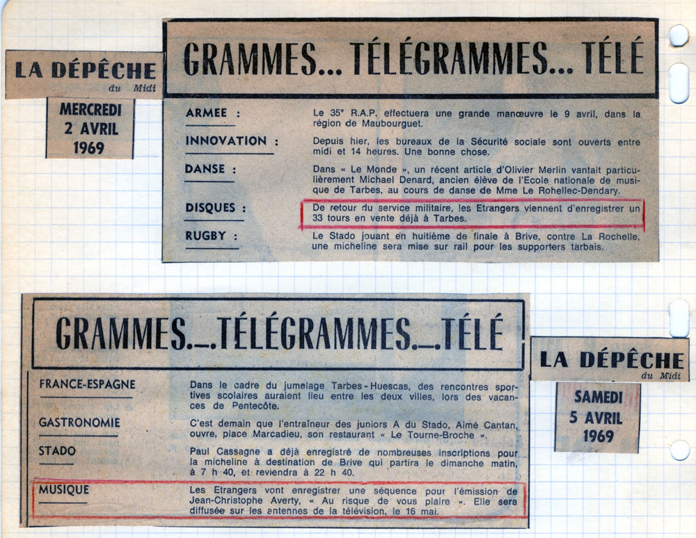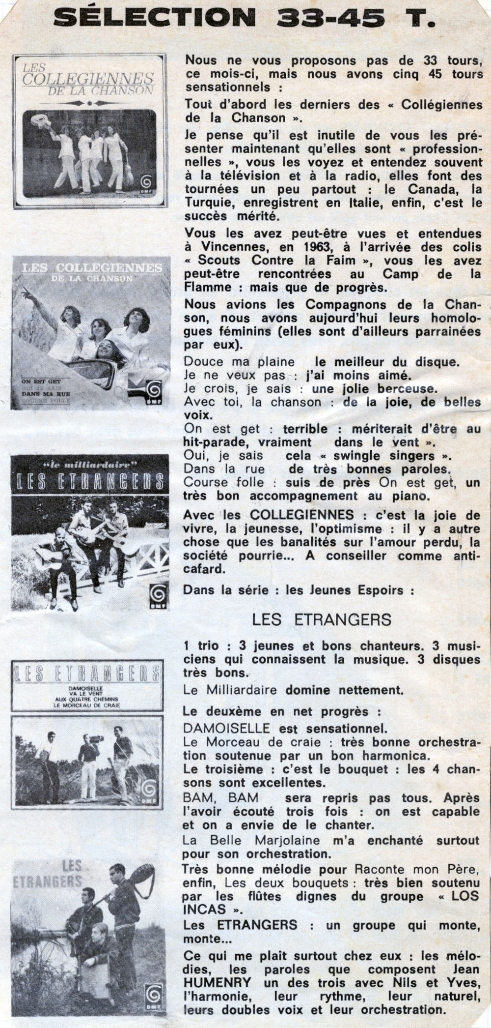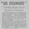 Les chansons des Etrangers sont vraiment les témoins de ce temps. La générosité, l’amitié, l’ouverture aux autres, l’amour, les droits de l’homme en sont les principaux thèmes. La musicalité des trois 45 tours et du 33 tours enregistrés par le groupe montre leur niveau d’exigence, de travail et pourtant le plaisir de chanter, de jouer ensemble nous est directement transmis. Repérés et soutenus par Sud Radio et Claude Barrière, le créateur des productions Olympia du Sud-Ouest, Les Etrangers seront même engagés pour faire les premières parties de grands artistes de la chanson : Jacques Brel (excusez du peu !), Marcel Amont, les Compagnons de la chanson.