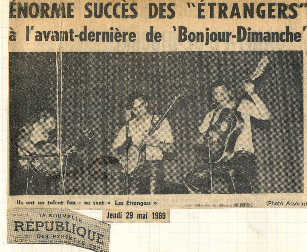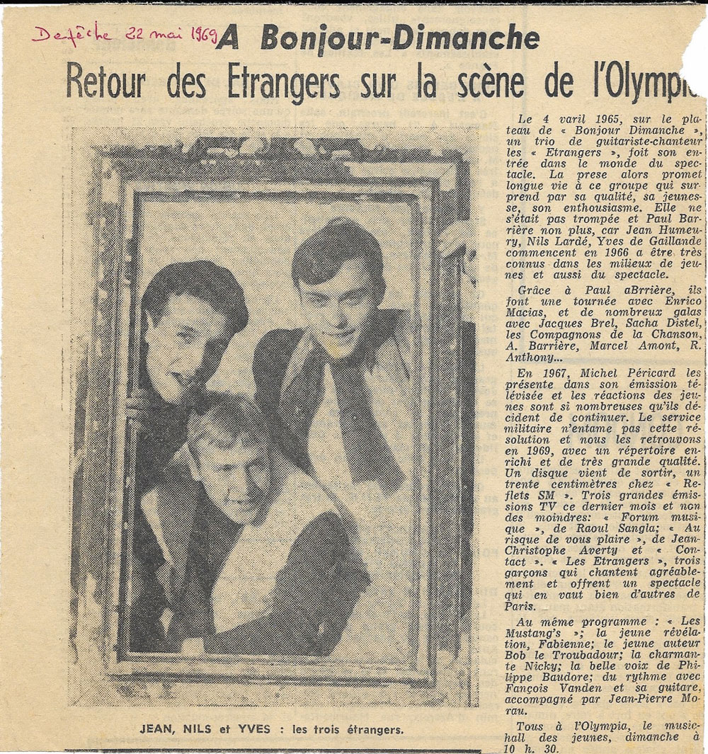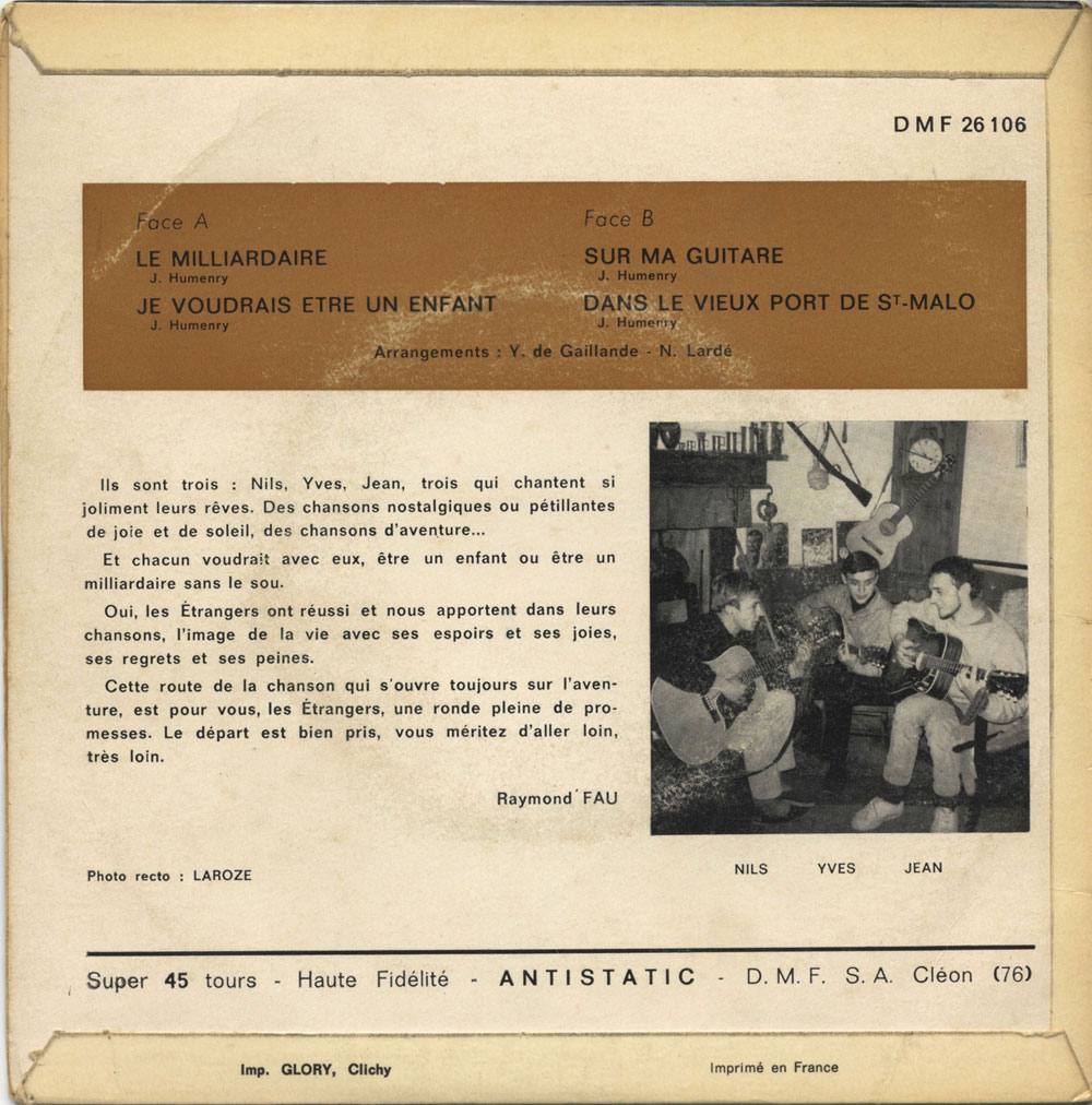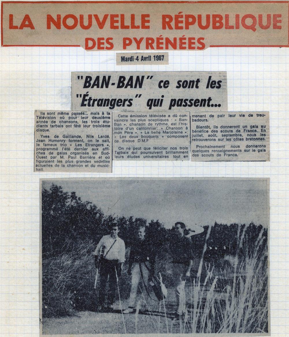 Yves de Gaillande, Nils Lardé et Jean Humenry, alias Les Etrangers, se rencontrent au lycée, à Tarbes. La guitare, le banjo, l’harmonica leur procurent le plaisir de jouer ensemble, comme tous les jeunes musiciens de leur âge. Ils sont influencés par les mélanges musicaux de cette époque entre deux eaux, entre insouciance, avidité de vivre et prise de conscience des maux de ce monde. Ils écoutent Woody Guthrie, Bob Dylan, Peter Paul and Mary, Joan Baez. Jacques Brel, Guy Béart et Hugues Aufray (qui, cette même année, chante Santiano) marquent sans doute leur désir de chanter en Français. Ils reprendront d’ailleurs N’y pense plus tout est bien, alchimie entre la musique de Dylan et l’adaptation de Pierre Delanoë et Aufray.