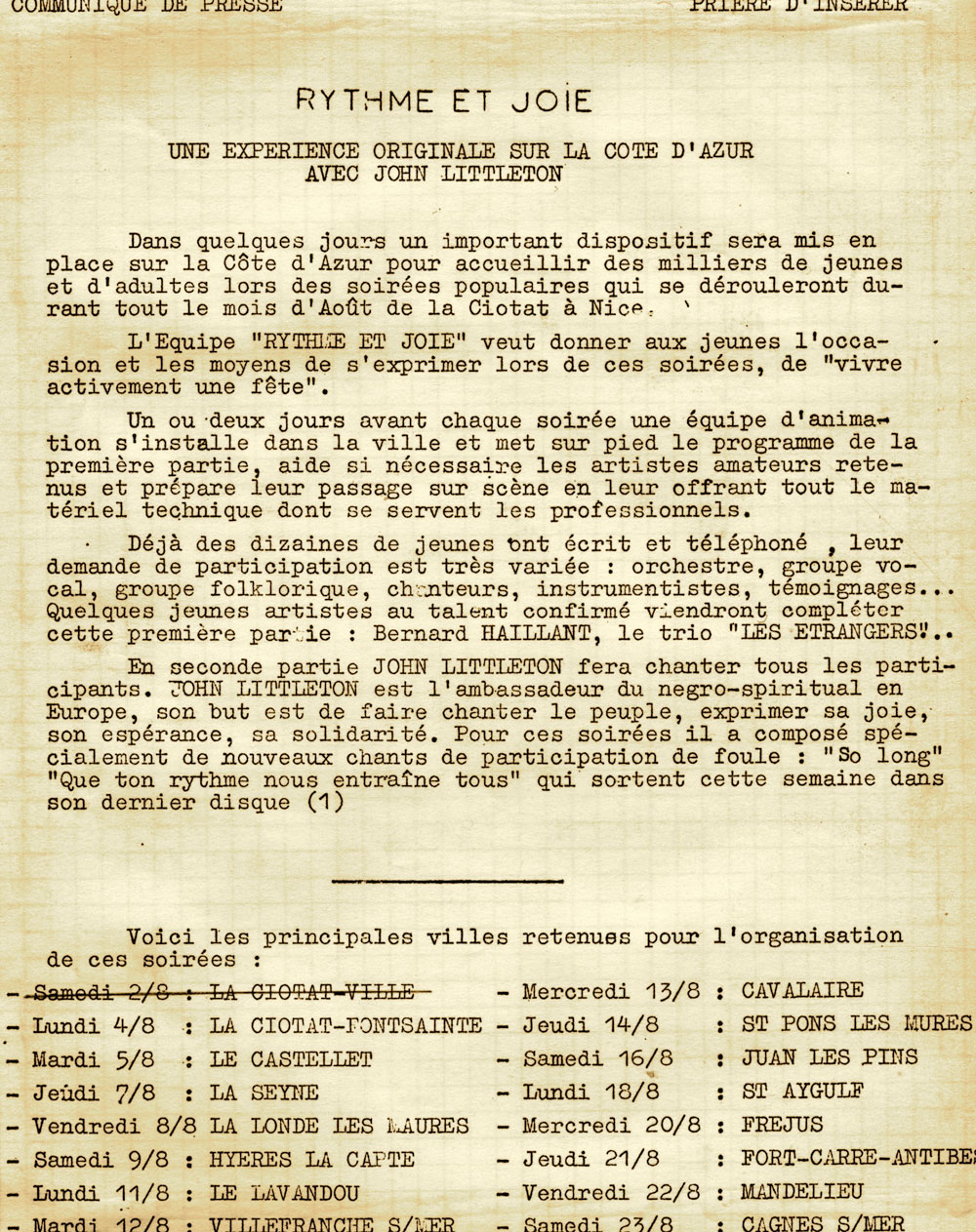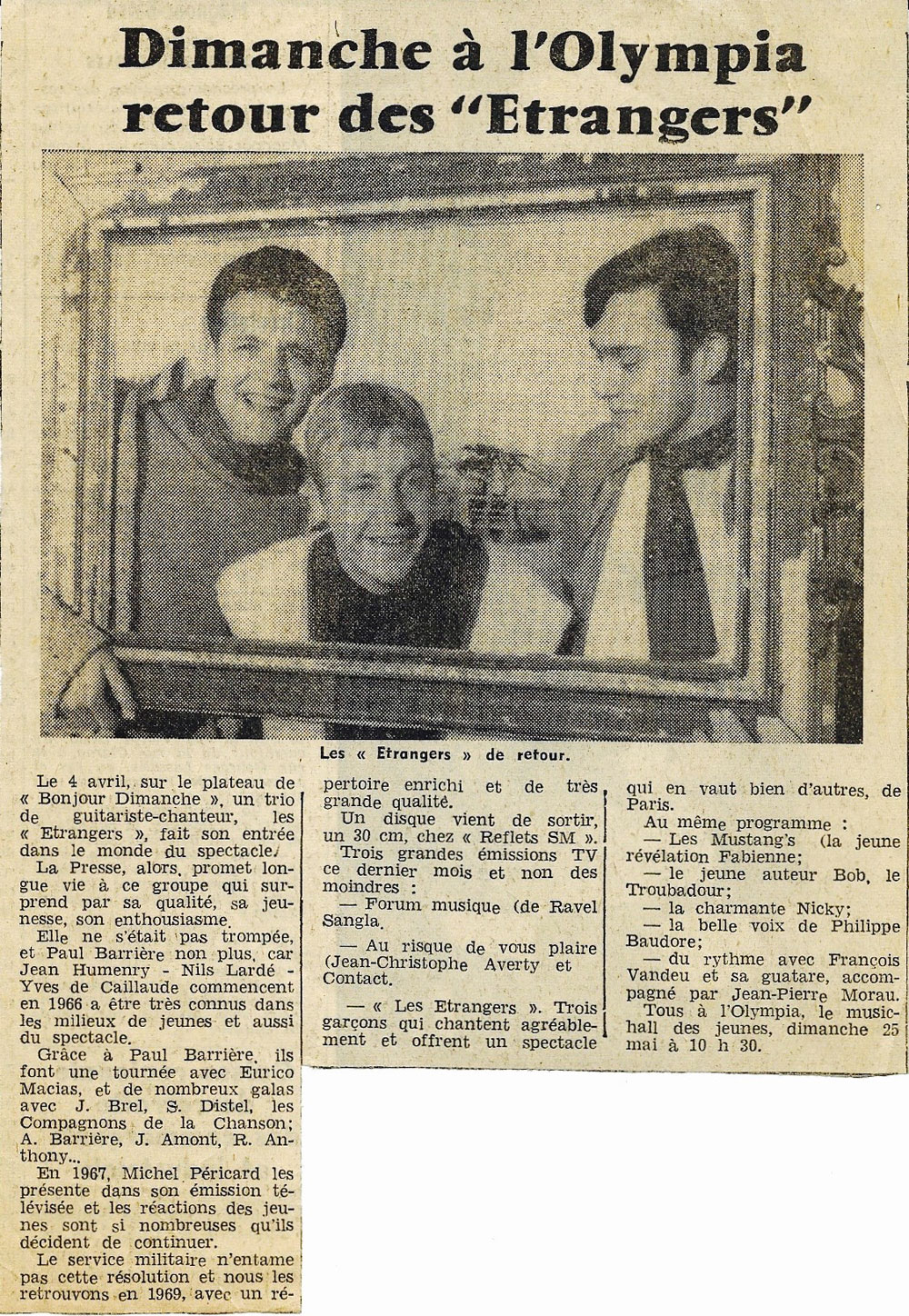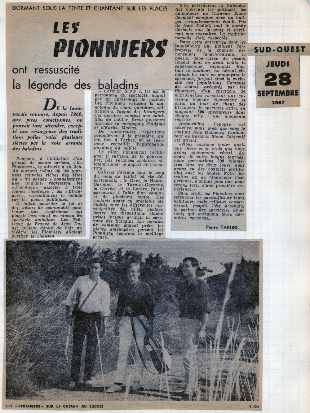 Yves de Gaillande, Nils Lardé et Jean Humenry, alias Les Etrangers, se rencontrent au lycée, à Tarbes. La guitare, le banjo, l’harmonica leur procurent le plaisir de jouer ensemble, comme tous les jeunes musiciens de leur âge. Ils sont influencés par les mélanges musicaux de cette époque entre deux eaux, entre insouciance, avidité de vivre et prise de conscience des maux de ce monde. Ils écoutent Woody Guthrie, Bob Dylan, Peter Paul and Mary, Joan Baez. Jacques Brel, Guy Béart et Hugues Aufray (qui, cette même année, chante Santiano) marquent sans doute leur désir de chanter en Français. Ils reprendront d’ailleurs N’y pense plus tout est bien, alchimie entre la musique de Dylan et l’adaptation de Pierre Delanoë et Aufray.